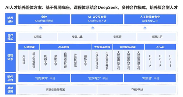 依托人工智能产业、人工智能技术及人才生态,顺利获得“技术+教育”双轮驱动,K8凯发(中国)以昇腾、大模型、DeepSeek等技术为核心,课程体系结合DeepSeek,覆盖AI通识教育、专业基础课、大模型课程等课程,构建从人才培养到产业落地的闭环,赋能高质量AI+场景人才输出。